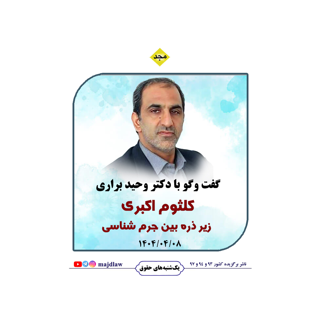 ⚖️ کلثوم اکبری زیر ذره‌بین جرم‌شناسی | گفت‌وگو با دکتر وحید براری 🎙️ یکشنبه‌های حقوق مجد | قسمت ۱۶۰ ✍️ در دل تاریکیِ یکی از عجیب‌ترین پرونده‌های جنایی ایران، زنی به نام کلثوم اکبری ایستاده است؛ زنی که با لبخندی آرام و نیتی پنهان، مردان مسن را با وعده ازدواج به مرگ کشاند.اما پشت این چهره‌ی سرد و این قتل‌های خاموش، چه داستانی نهفته است؟ قربانی خشونت بود یا خود...